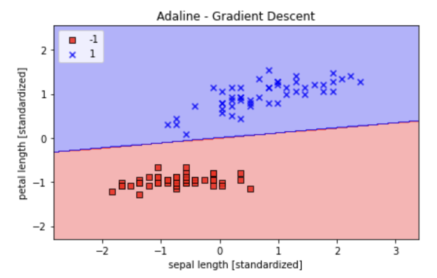 학습률 η=0.01 사용, 표준화된 특성에서 훈련 => 아달린 모델 수렴