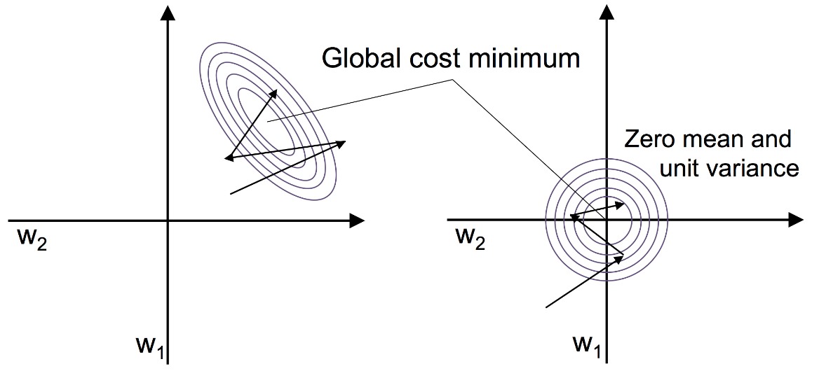 표준화가 경사 하강법 학습에 도움되는 이유: 더 적은 단계 거쳐 최적/좋은 솔루션 찾음