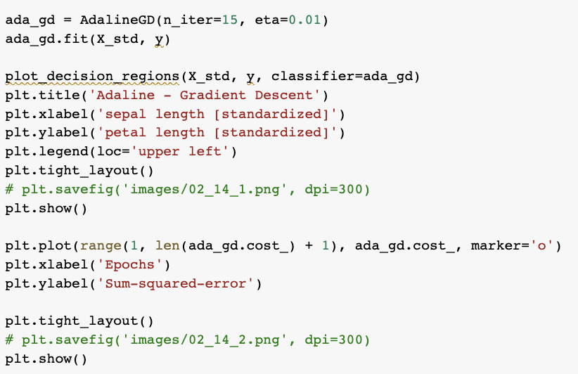 학습률 η=0.01 사용, 표준화된 특성에서 훈련 => 아달린 모델 수렴