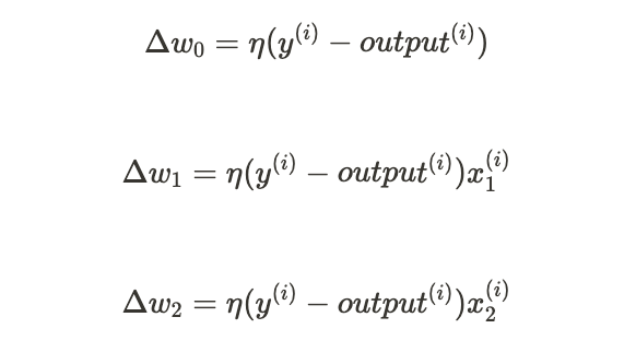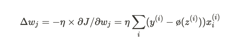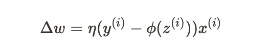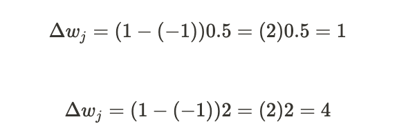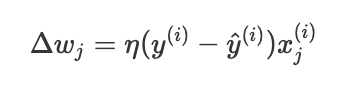 가중치 w_j에 대한 업데이트 값(or w_j의 변화량) Δw_j 값 -> 퍼셉트론 학습 규칙 따라 계산