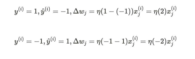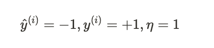 가중치 +1 -> 다음번 이 샘플 만날 경우 최종 입력 x_j^{(i)} * w_j 가 더 큰 양수가 됨
