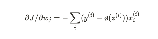 비용 함수의 그레이디언트 계산 -> 각 가중치 w_j에 대한 편도 함수 계산