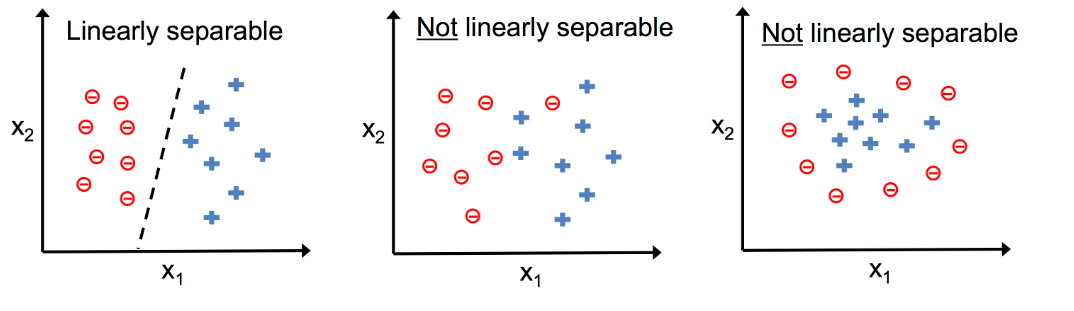if 두 클래스 -> 선형 결정 경계로 나눌 수 X