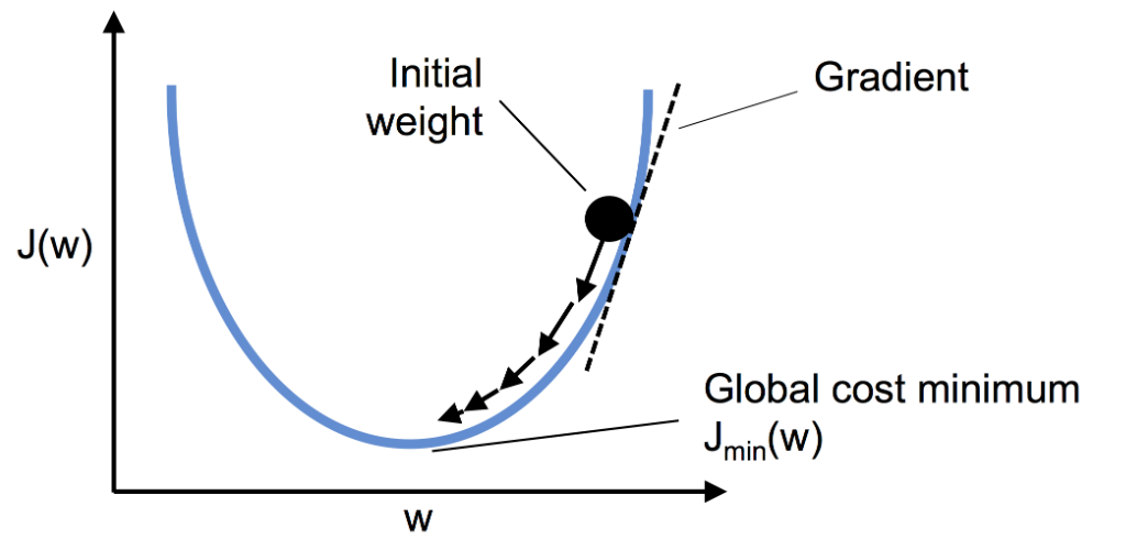- : 전체 훈련 데이터셋에서 계산한 그레이디언트의 반대 방향으로 한 걸음씩 진행 -> 비용 함수 최소화