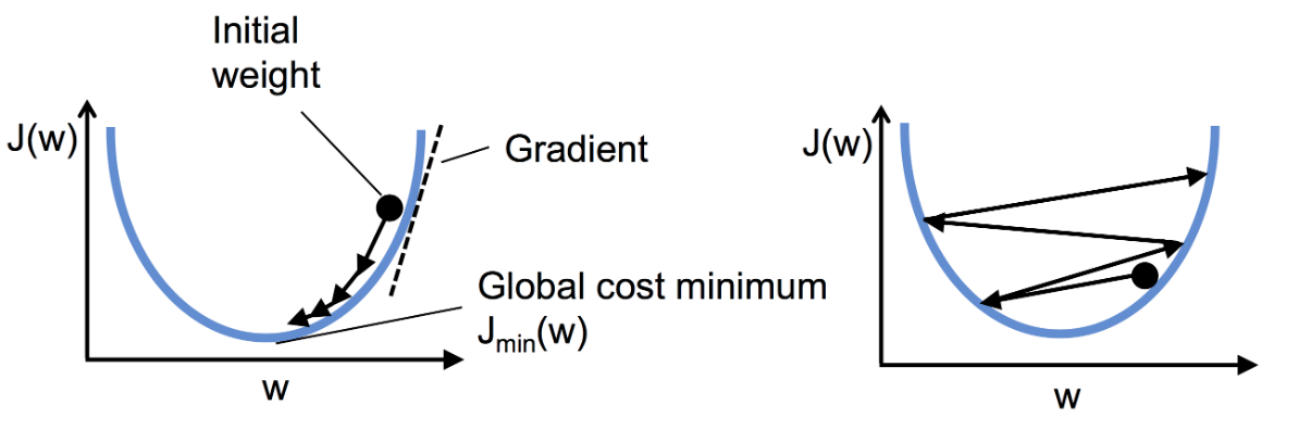 - L: 적절하게 선택한 학습률 경우/ 비용 점차 ↓ -> 전역 최솟값의 방향으로 이동