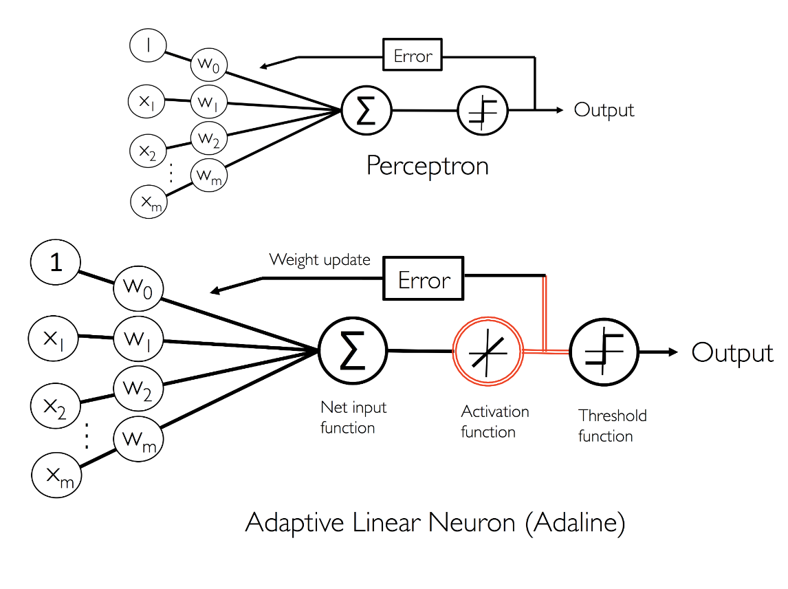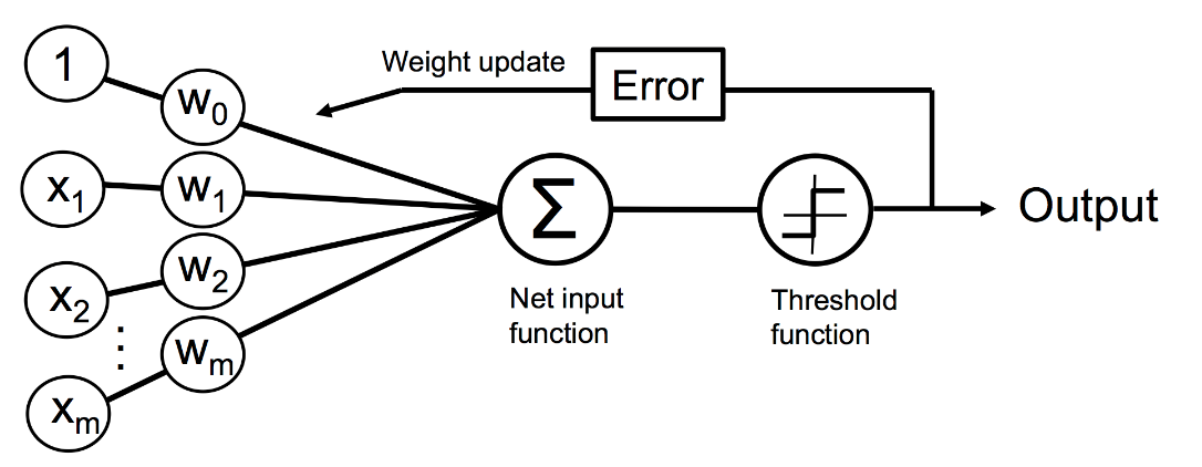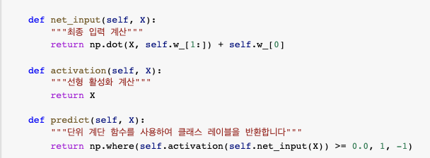 - 최종 입력 -> 임계 함수로 전달 -> 샘플의 예측 클래스 레이블인 -1 or +1 이진 출력 만듦