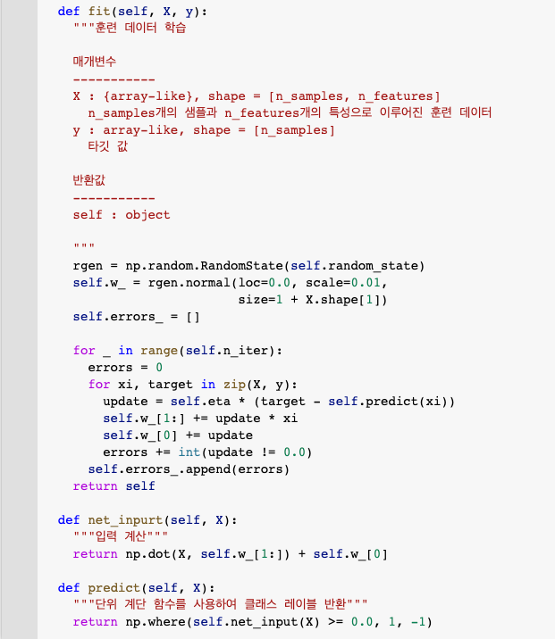fit 메서드에서 훈련하는 동안 가중치 업데이트 위해 predict 메서드 호출 -> 클래스 레이블에 대한 예측