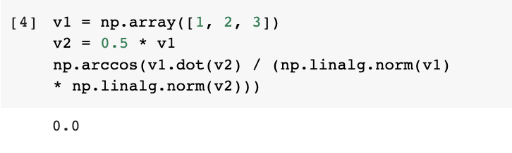 벡터 v1 = [1 2 3] 있을 때 v1과 벡터 v2 = 0.5 * v1 사이 각 = 0