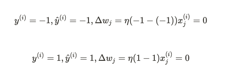 1. 퍼셉트론: 클래스 레이블 정확히 예측 -> 가중치 변경X 그대로 유지 => 업데이트 값 0