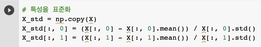ex. j번째 특성 표준화 -> 모든 샘플에서 평균 μ_j를 빼고 표준 편차 σ_j로 나눔
