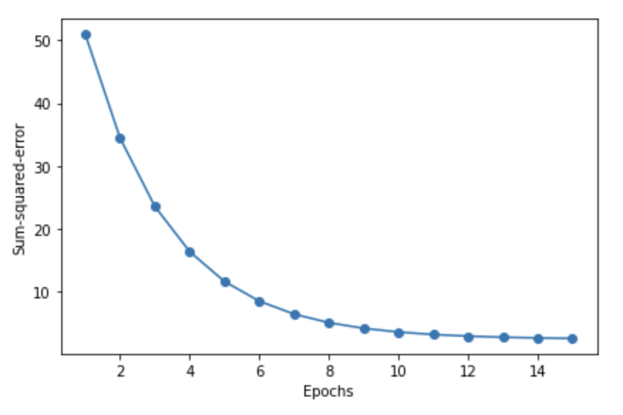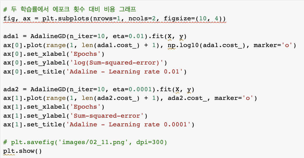 에포크 횟수 대비 비용 함수의 값 -> 그래프 => 아달린 구현이 훈련 데이터에서 얼마나 잘 학습하는지 확인 가능