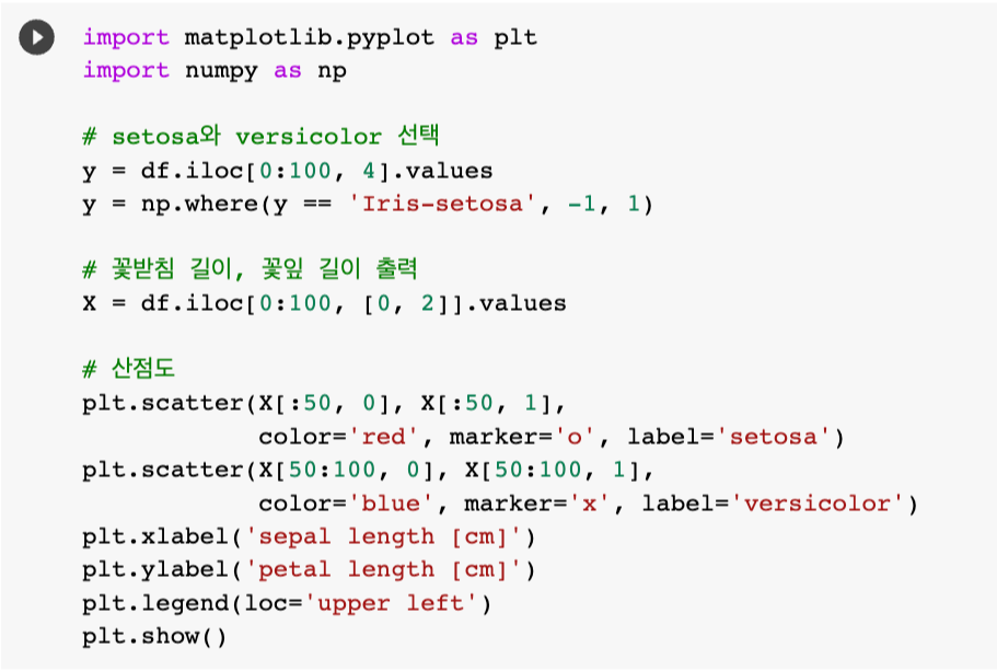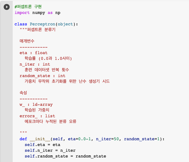 퍼셉트론 구현 사용 -> 학습률 eta, 에포크 횟수(: 훈련 데이터셋을 반복하는 횟수) n_iter
