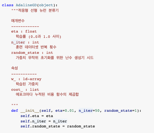 *관례에 따라 객체의 초기화 과정에서 생성X, 다른 메서드 호출해서 만든 속성 -> 밑줄(_) 추가 (ex. self.w_)