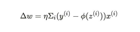 모든 샘플 x^{(i)}에 대해 누적된 오차 합 기반 -> 가중치 업데이트