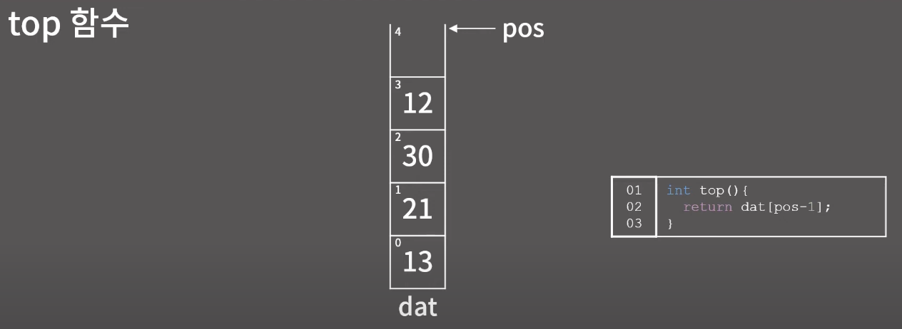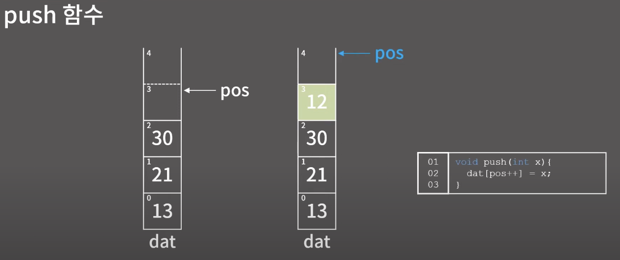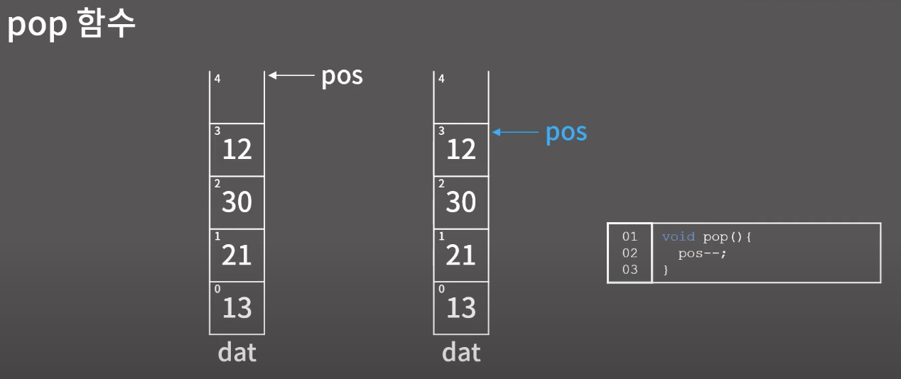 pos는 다음에 원소가 추가될 때 삽입해야 하는 곳 가리킴 -> pos의 값 = 스택의 길이(스택 내의 원소의 수)