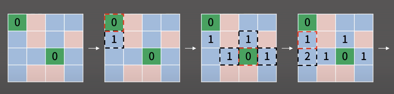 -> vis[nx][ny] == true or dis[nx][ny] >= 0 확인, 이미 방문한 칸 -> continue