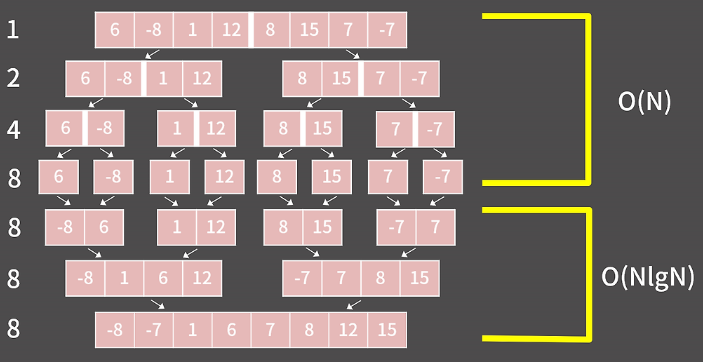 - 분할이 완료됐을 때 리스트위 원소는 1개였다가 2^k개가 될 때까지 매번 2배씩 커짐