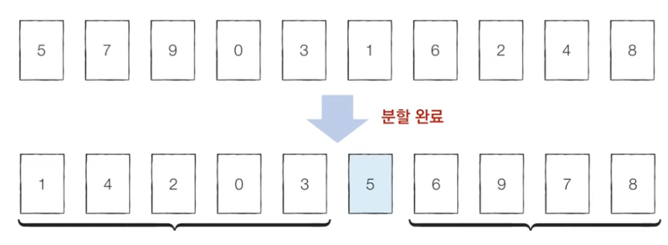 - 한 번 기준 원소(Pivot)가 변경해서 자리 잡으면 그 기준 원소의 위치 바뀌지 X