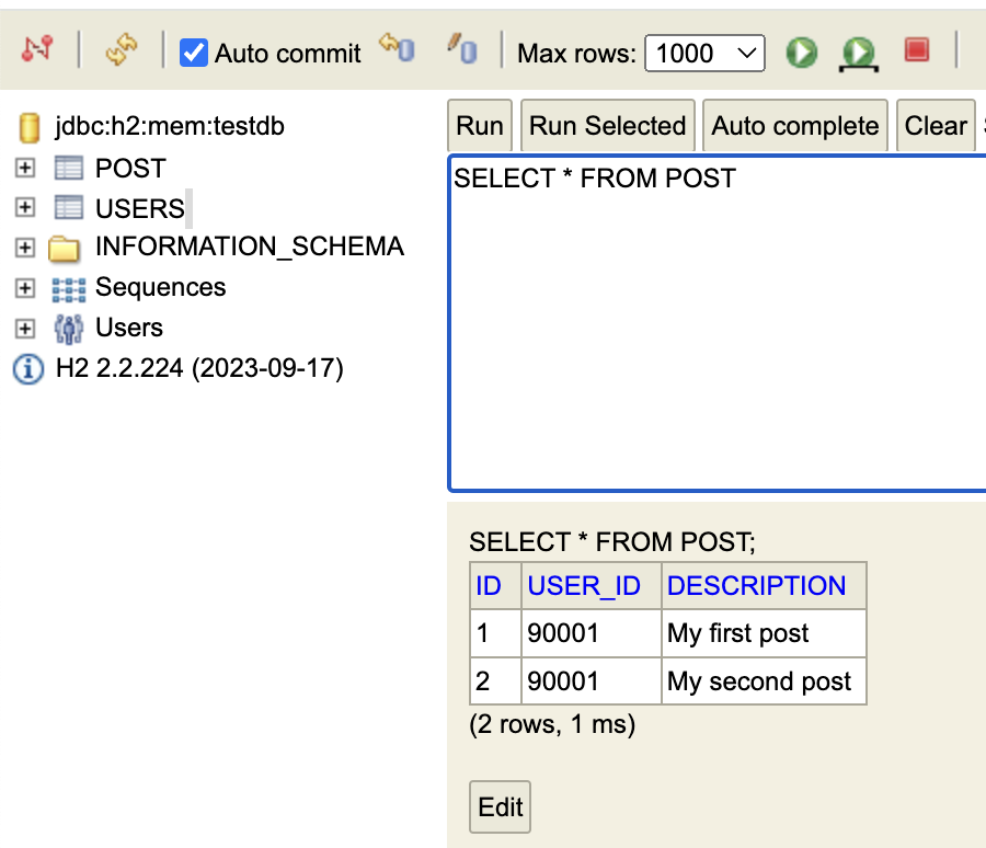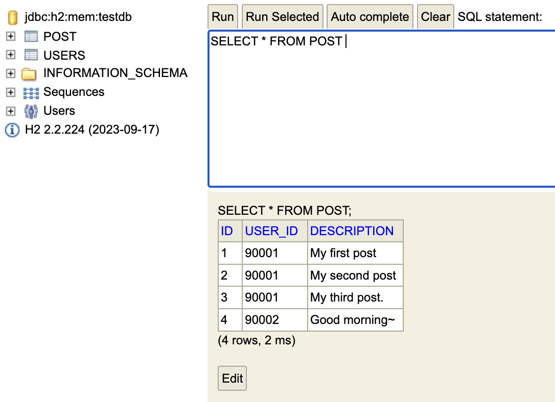 insert into post(description, user_id) values ('My second post', 90001);