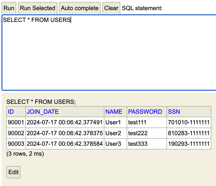 insert into users(id, join_date, name, password, ssn) values (90003, now(), 'User3', 'test333', '190293-1111111');