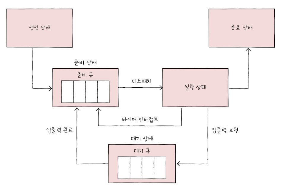-> 스케줄링 큐로 구현하고 관리(효율적 스케줄링)
