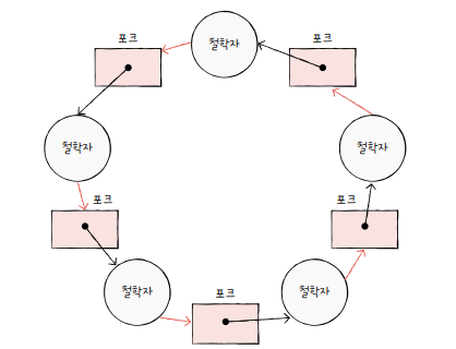 철학자: 프로세스 or 스레드/ 포크: 자원/ 생각하는 행위: 자원을 기다리는 것