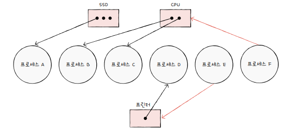 - 프로세스가 어떤 자원 기다리고 있음: 프로세스 -> 자원(화살표 표시)