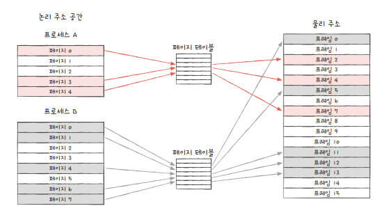 각 프로세스의 페이지 테이블 -> 자신의 고유한 페이지가 할당된 프레임 가리킴
