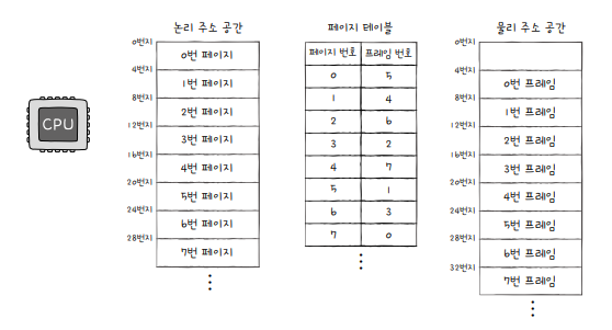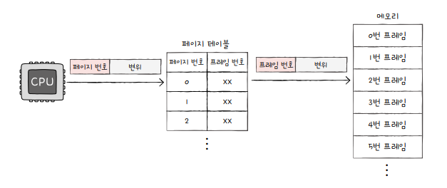- CPU -논리 주소-> 페이지 테이블 -물리 주소-> 메모리