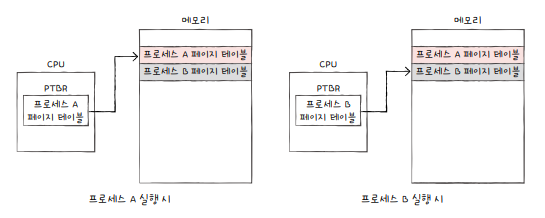 CPU 내에서 각 프로세스의 페이지 테이블이 적재된 주소 가리킴
