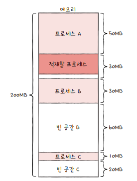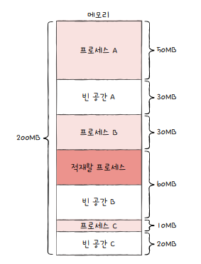 비어 있는 메모리 공간에 프로세스 연속적으로 할당하는 방법