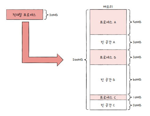 - 프로세스가 적재될 수 있는 가장 작은 공간에 프로세스 배치