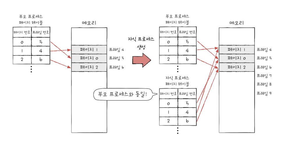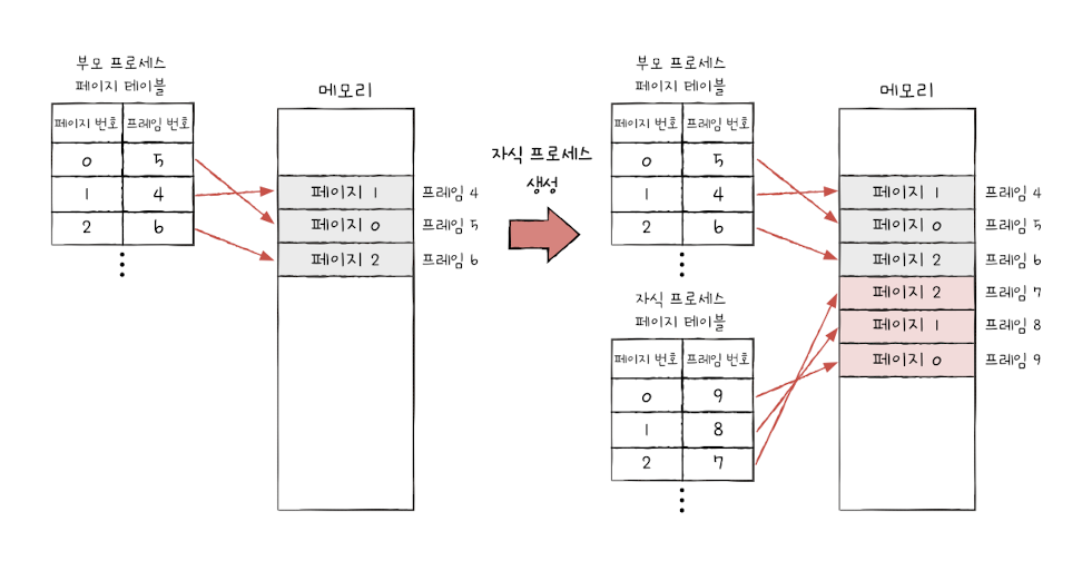 쓰기 시 복사: 부모 프로세스와 동일한 자식 프로세스 생성 -> 자식 프로세스가 부모 프로세스와 동일