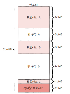 - 프로세스 실행, 종료 반복 -> 메모리 사이 사이 빈 공간 생김 -> 큰 프로세스 적재 X => 메모리 낭비