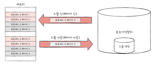 - 스왑 아웃 = 페이지 아웃(page out): 메모리에 적재될 필요 X 페이지 -> 보조기억장치