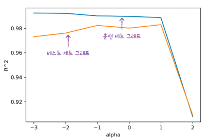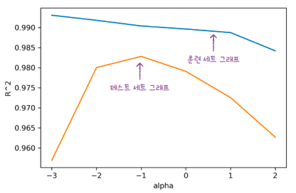 훈련 세트와 테스트 점수가 가장 가까운 지점 -> 최적의 alpha 값