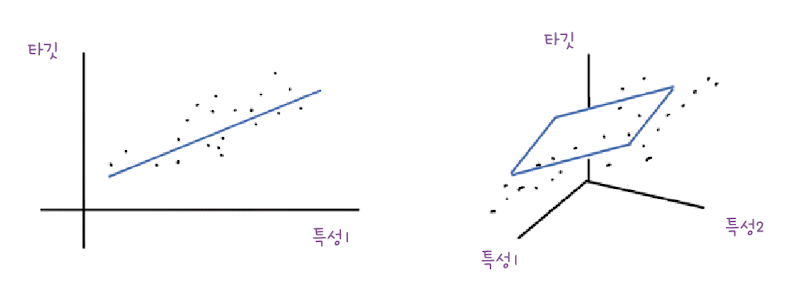 하나의 특성 사용 -> 특성 데이터: x축/ 타깃 데이터: y축