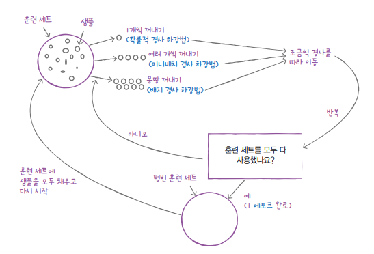 - 확률적 평균 경사 하강법 알고리즘 특성과 샘플 수 ↑ -> 성능 빠르고 좋음