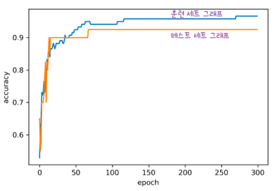 - But, 훈련 반복 -> 모델이 훈련 세트에 점점 더 잘 맞음 => 과대 적합, 테스트 세트 정확도 ↓