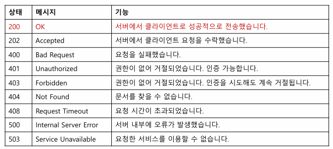 - 2xx: 자료 요청 수락 or 자료 전송이 성공적으로 끝남