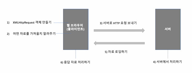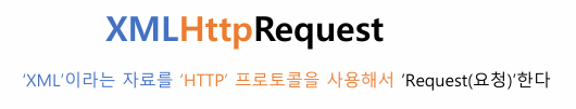 - 웹 브라우저) 데이터 요청 -> 서버/ 서버에서 자료 받아올 때 HTTP 통신이 가능한 XMLHttpRequest 객체 사용함