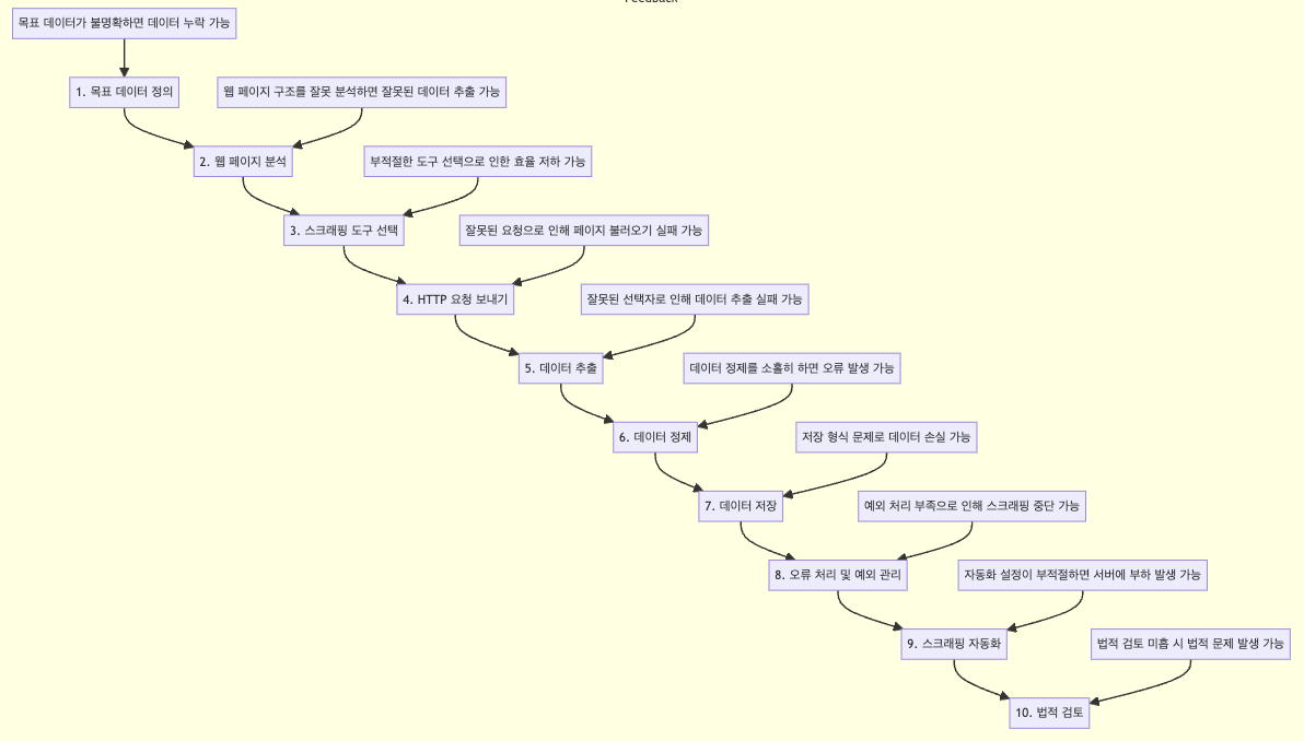 웹스래핑 과정을 10가지 단계로 나열하고 안 되는 과정에 대한 피드백을 추가해서 작성할 것