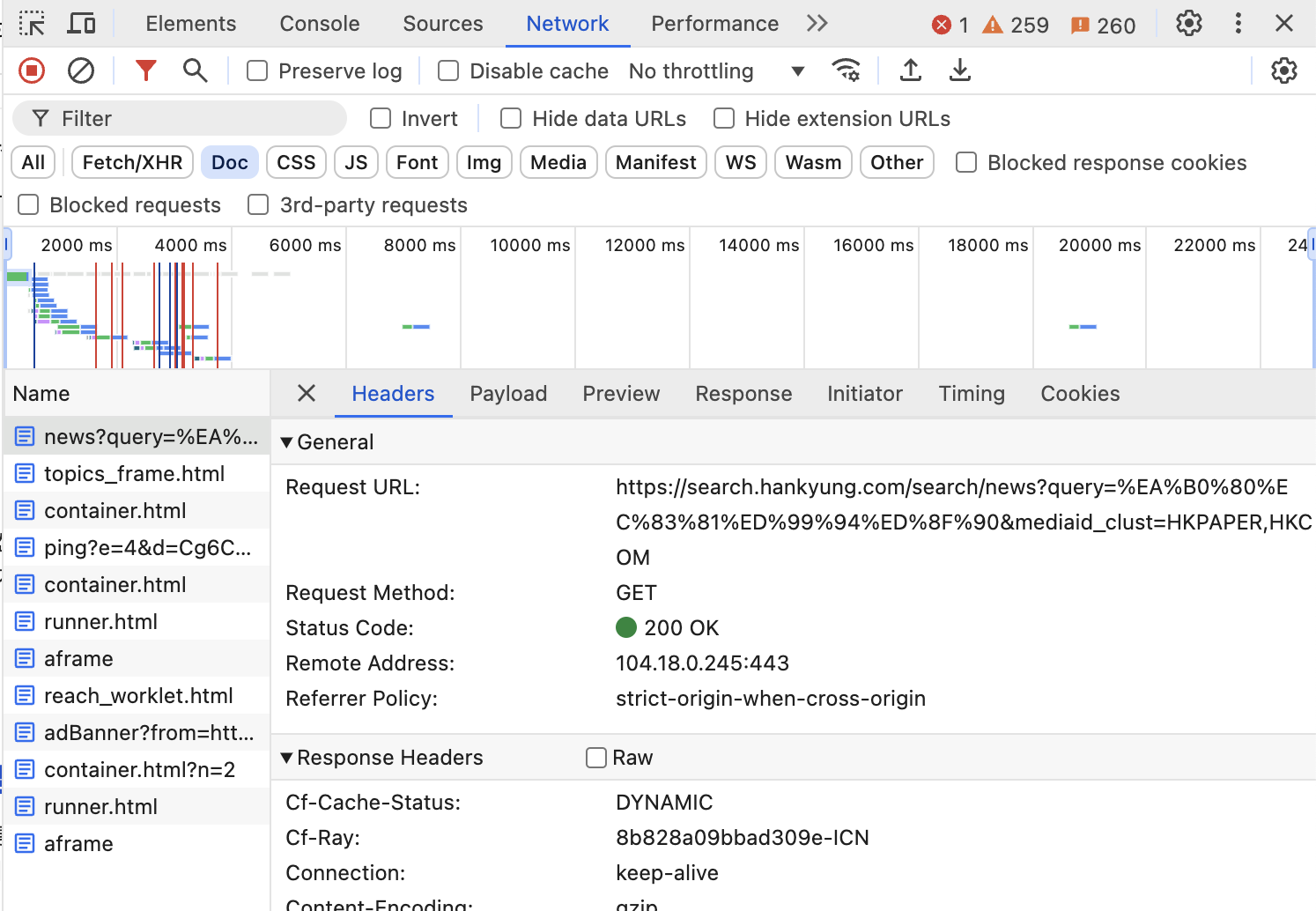 2. Network 탭 > Doc (Header, Payload, Preview, Response 확인)