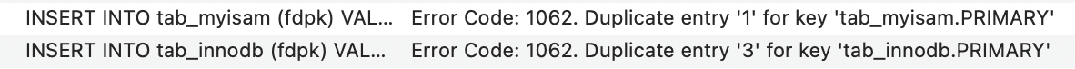 => 두 `INSERT` 문장 보두 프라이머리 키 중복으로 실패