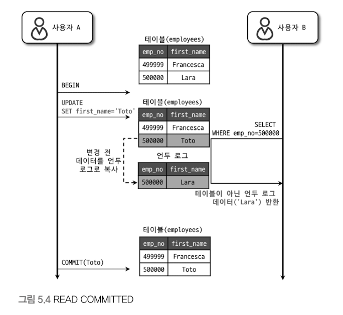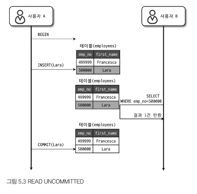 B: 커밋 전 emp_no=500000인 사원 SELECT -> Lara로 조회 (employees 테이블 X 언두 영역에 백업된 레코드에서 가져옴)