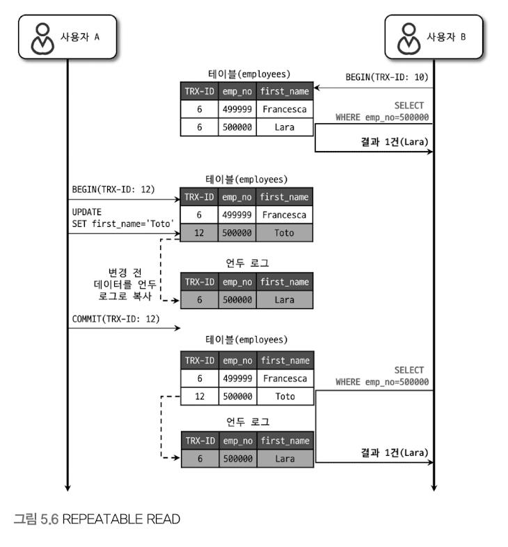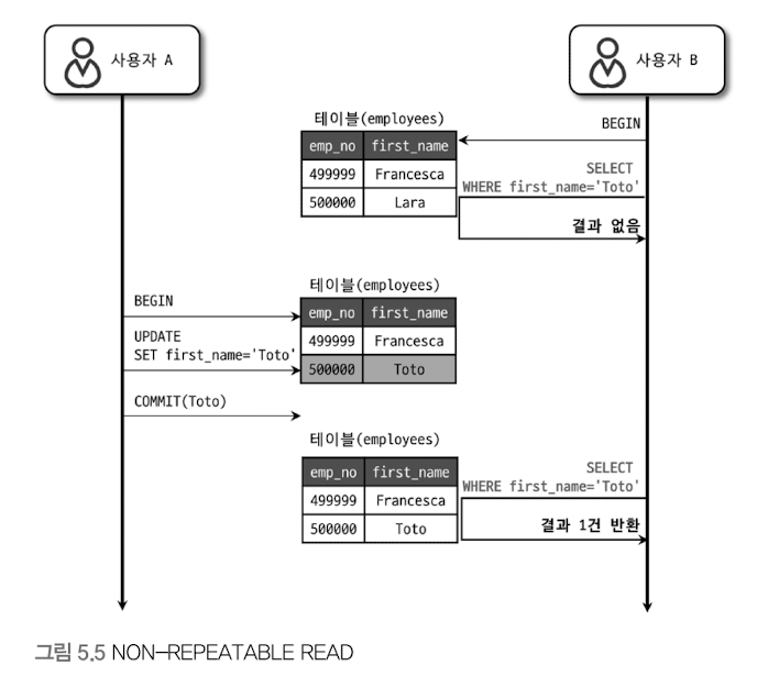 But, B: emp_no=500000인 사원을 A 트랜잭션 변경 전후 각각 한 번씩 `SELECT` -> Lara