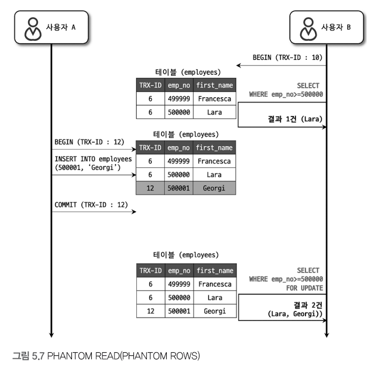 PHANTOM READ(PHANTOM ROW): 다른 트랜잭션에서 수행한 변경 작업에 의해 레코드가 보였다 안보였다 하는 현상