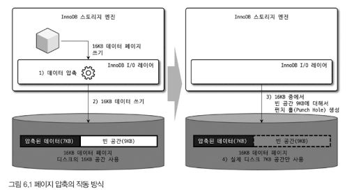 - MySQL 서버가 디스크에 저장하는 시점에 데이터 페이지 압축돼 저장