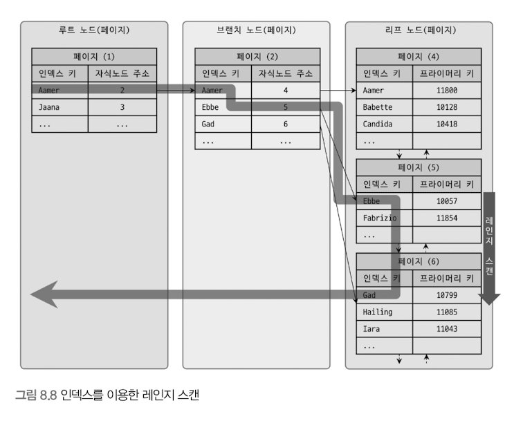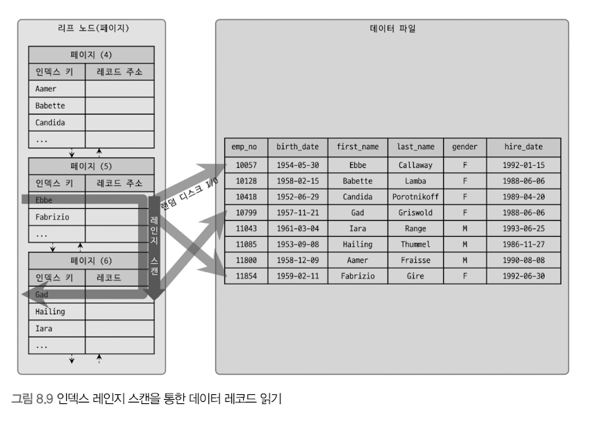 - 인덱스 레인지 스캔: 데이터를 읽기 위해 주로 랜덤 I/O를 사용