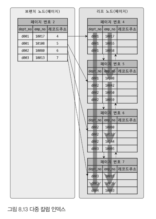 => 케이스 B의 인덱스는 다중 칼럼으로 구성된 인덱스 -> (`dept_no` 대해 정렬 -> 다시 `emp_no`값으로 정렬)